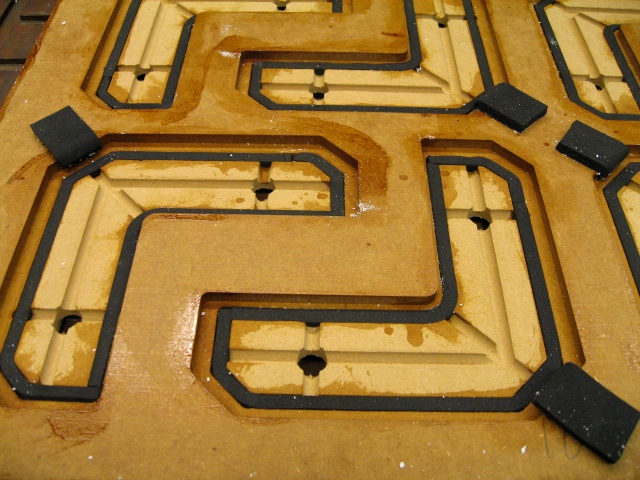 The black rectangles are pieces of foam which push the parts into place to make sure they are accurately positioned.