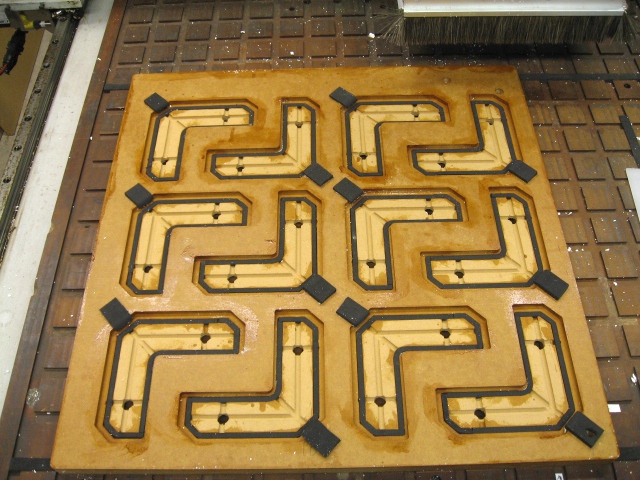 This foam is a bit different to work with from the sheets of pink or blue foam you get at the big box lumberyard, which has a smooth skin on it. That smooth skin is pretty impermeable, so when you apply a vacuum to the bottom to hold it down it pulls down tight. The white foam allows some air to move through it, so in order to hold it down securely you have to move a lot of air away from the bottom side, which required building a special vacuum fixture. Here it is with the parts in it after machining: