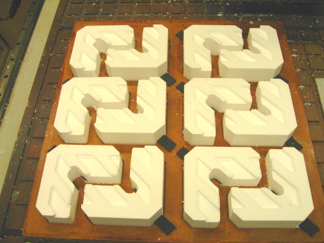 Here’s an industrial job I did for Polyfoam, Inc. Lots of interesting uses for expanded polystyrene foam on their site, as well as some impressive recycling stats. They were working with a window manufacturer to design packaging material for windows and needed 200 sets of prototype parts to test the design. They provided blanks and I cut the recesses in them. Here’s the before and after: