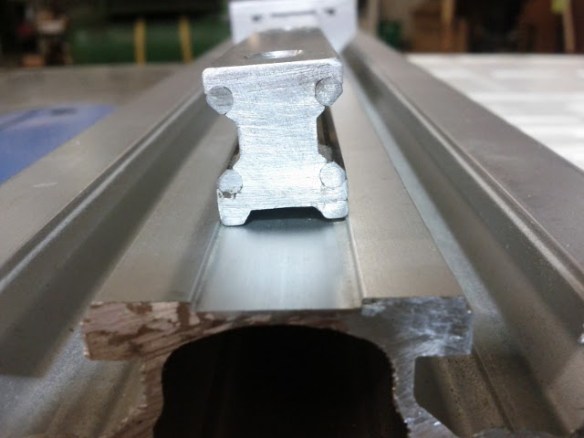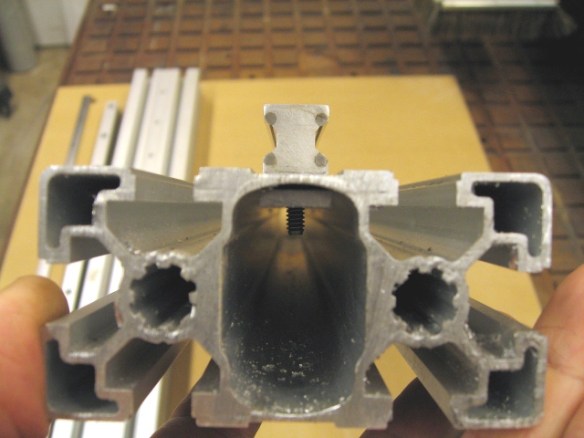The plan was to mount them to the 80/20 style extrusions, but as can be seen from the photo above, the channel neede to be widened a bit for the extrusion to sit flat. Holes needed to be drilled through the 80/20 for mounting screws, and steel backing plates made, since the 80/20 is thin in the center.